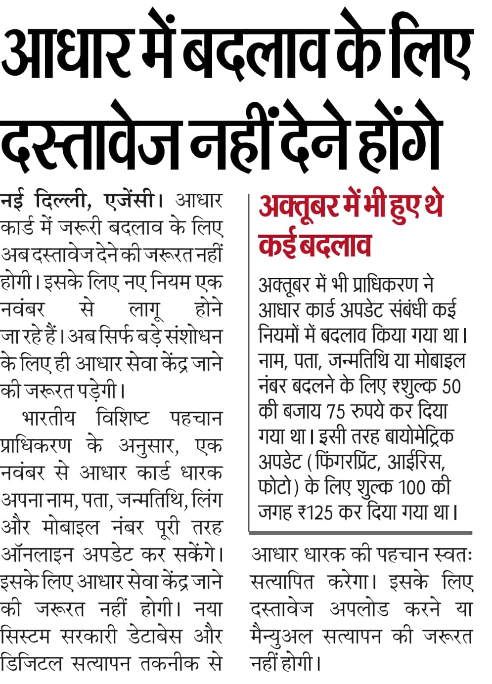 | Post Name | Aadhar Card Update Without Document – New Rule : आधार कार्ड में बड़ा बदलाव, अब बिना दस्तावेज के होगा सुधार वो भी घर बैठे |