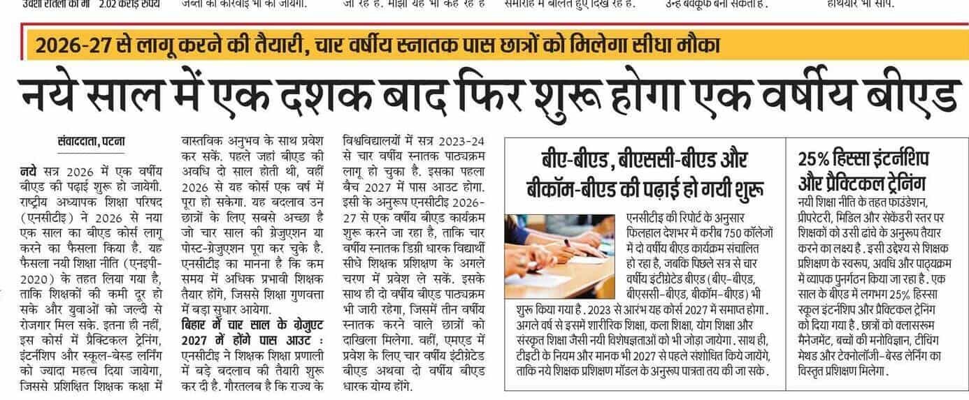 आपको बता दे की बिहार में चार साल के ग्रेजुएट 2027 में पास आउट होंगे | तो इस स्थिति को देखते हुए एनसीटीई 2026-27 से एक वर्षीय बीएड कार्यक्रम शुरू करने जा रहा है , ताकि चार वर्षीय स्नातक डिग्री धारक विद्यार्थी सीधे शिक्षक प्रशिक्षण के अगले चरण में प्रवेश ले सकें | इसके साथ ही दो वर्षीय बीएड पाठ्यक्रम भी जारी रहेगा | जिसमे तीन वर्षीय स्नातक करने वाले छात्रो को दाखिला मिलेगा | वहीँ, एमएड में प्रवेश के लिए चार वर्षीय इंटीग्रेटेड बीएड अथवा दो वर्षीय बीएड धारक योग्य होंगे |