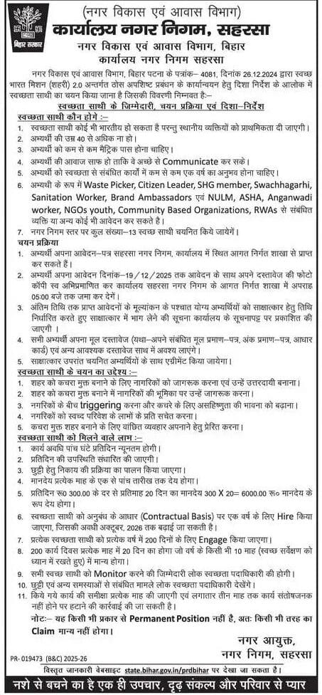 - अभ्यर्थी अपना आवेदन दिनांक -19.12.2025 तक आवेदन के साथ अपने दस्तावेज की फोटो कॉपी स्व अभिप्रमाणित कर कार्यालय सहरसा नगर निगम में आगत निर्गत शाखा में अपराह्न 05 :00 बजे तक जमा कर देने |