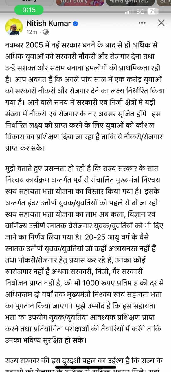 मुझे बताते हुए प्रसन्नता हो रही है कि राज्य सरकार के सात निश्चय कार्यक्रम अन्तर्गत पूर्व से संचालित मुख्यमंत्री निश्चय स्वयं सहायता भत्ता योजना का विस्तार किया गया है। इसके अन्तर्गत इंटर उत्तीर्ण युवक/युवतियों को पहले से दी जा रही स्वयं सहायता भत्ता योजना का लाभ अब कला, विज्ञान एवं वाणिज्य उत्तीर्ण स्नातक बेरोजगार युवक/युवतियों को भी दिए जाने का निर्णय लिया गया है। 20-25 आयु वर्ग के वैसे स्नातक उत्तीर्ण युवक/युवतियां जो कहीं अध्ययनरत नहीं हैं तथा नौकरी/रोजगार हेतु प्रयास कर रहे हैं; उनका कोई स्वरोजगार नहीं है अथवा सरकारी, निजी, गैर सरकारी नियोजन प्राप्त नहीं है, को भी 1000 रुपये प्रतिमाह की दर से अधिकतम दो वर्षों तक मुख्यमंत्री निश्चय स्वयं सहायता भत्ता का भुगतान किया जाएगा।