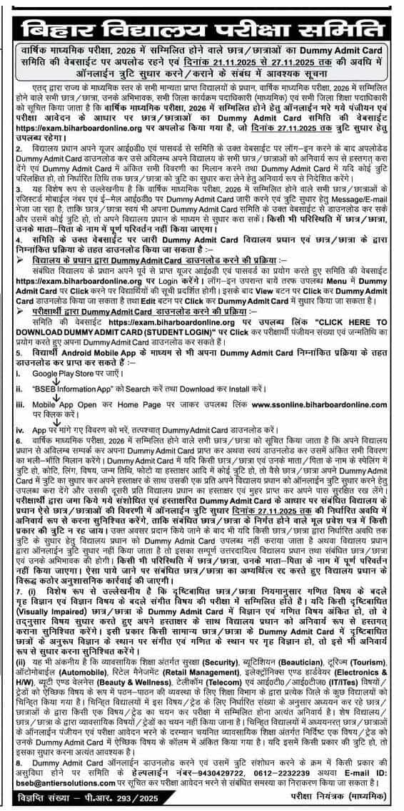 - वार्षिक माध्यमिक परीक्षा, 2026 का Dummy Admit Card में त्रुटी सुधार की तिथि :- 21/11/2025 से 27/11/2025 तक