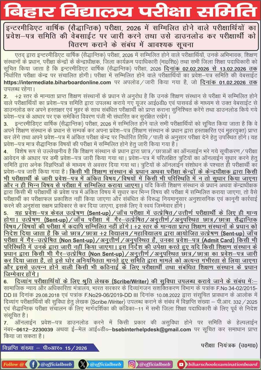 बिहार बोर्ड इंटर परीक्षा 2026 का एडमिट कार्ड आधिकारिक वेबसाइट पर जारी कर दिया गया है।