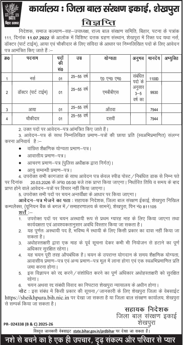 आवेदन-पत्र भेजने का पता :- सहायक निदेशक, जिला बाल संरक्षण इकाई, शेश्पुरा निखिल कम्पलैक्स , (यूनियन बैंक के बगल में/ समाहरणालय के सामने) , शेखपुरा, पिन नं. 811105
