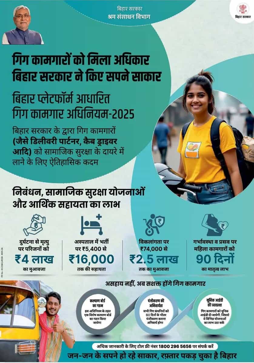 यह बिहार सरकार द्वारा शुरू की गई एक सामाजिक सुरक्षा योजना है जिसके तहत डिलीवरी पार्टनर, कैब ड्राइवर, ऑटो/ई-रिक्शा चालक और अन्य गिग कामगारों को दुर्घटना, बीमारी, विकलांगता और मातृत्व जैसे लाभ दिए जाएंगे।