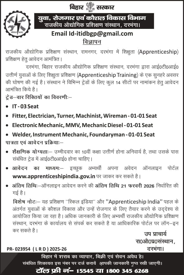 Bihar ITI Apprenticeship Training 2026 : राजकीय औद्योगिक प्रशिक्षण संस्थान, रामनगर , दरभंगा के शिक्षुता (Apprenticeship) प्रशिक्षण हेतु आवेदन आमंत्रित |