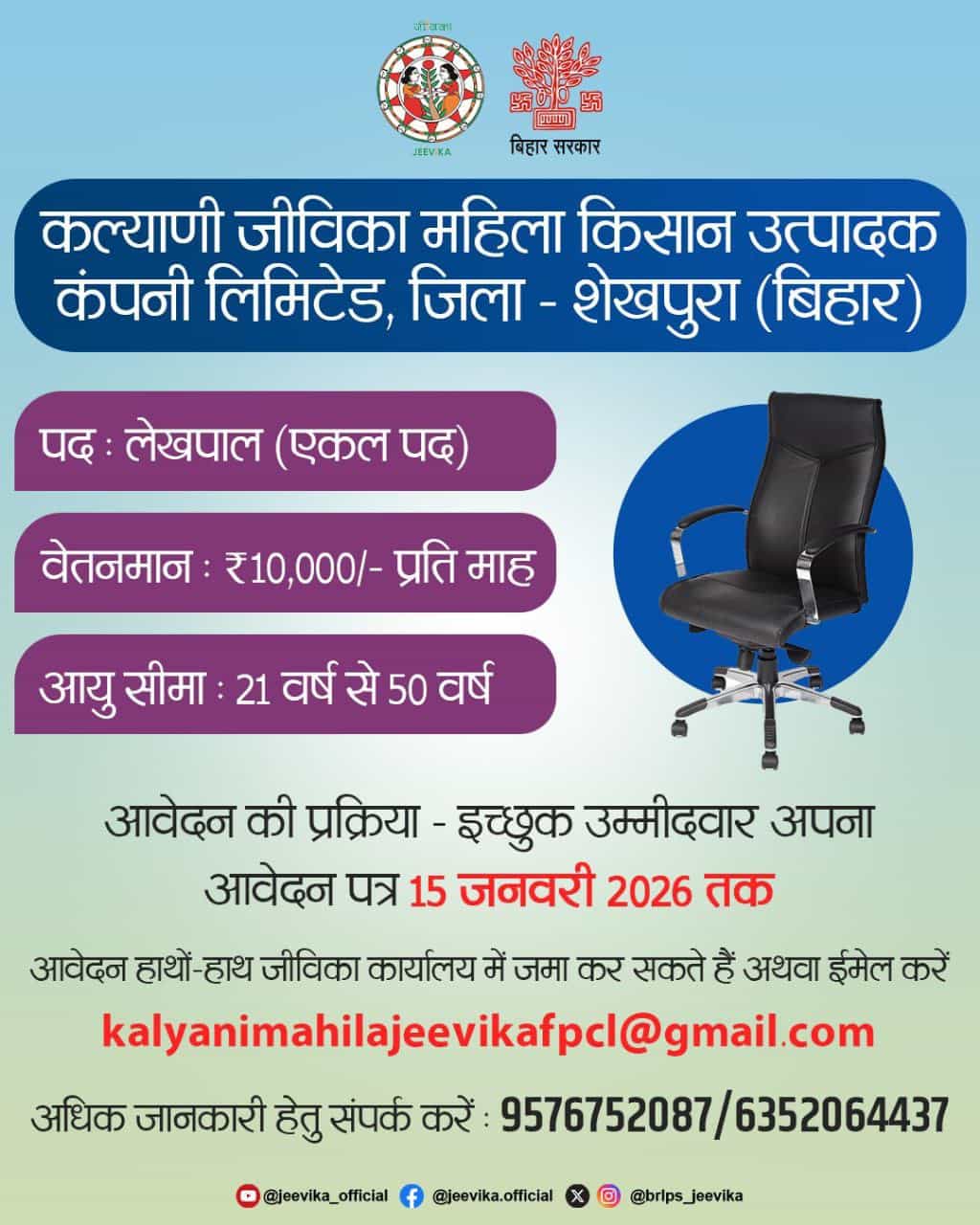 यह भर्ती कल्याणी जीविका महिला किसान उत्पादक कंपनी लिमिटेड, जिला शेखपुरा द्वारा लेखपाल (Accountant) पद के लिए निकाली गई है।