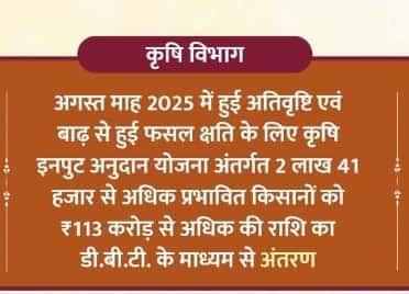 अगस्त माह 2025 में हुई अतिवृष्टि एवं बाढ़ से हुई फसल क्षति के लिए कृषि इनपुट अनुदान योजना अंतर्गत 2 लाख 41 हजार से अधिक प्रभावित किसानो को रु. 113 करोड़ से अधिक की राशी का डी.बी.टी. के माध्यम से अंतरण