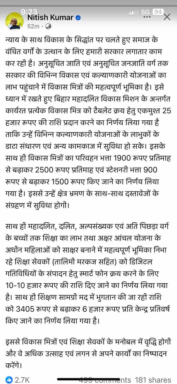 न्याय के साथ विकास के सिद्धांत पर चलते हुए समाज के वंचित वर्गों के उत्थान के लिए हमारी सरकार लगातार काम कर रही है। अनुसूचित जाति एवं अनुसूचित जनजाति वर्ग तक सरकार की विभिन्न विकास एवं कल्याणकारी योजनाओं का लाभ पहुँचाने में विकास मित्रों की महत्वपूर्ण भूमिका है। इसे ध्यान में रखते हुए बिहार महादलित विकास मिशन के अंतर्गत कार्यरत प्रदेशों विकास मित्र को टैबलेट क्रय हेतु एकमुश्त 25 हजार रुपये की राशि प्रदान करने का निर्णय लिया गया है ताकि उन्हें विभिन्न कल्याणकारी योजनाओं के लाभुकों के डेटा संधारण एवं अन्य कामकाज में सुविधा हो सके।