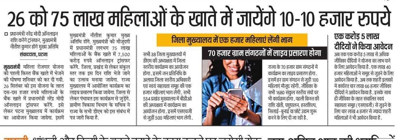 | Post Name | Bihar Mahila Rojar Yojana 2025 Payment Date : 75 Lakh महिलाओं को इस दिन मिलेंगे ₹10,000, जल्दी देखे |