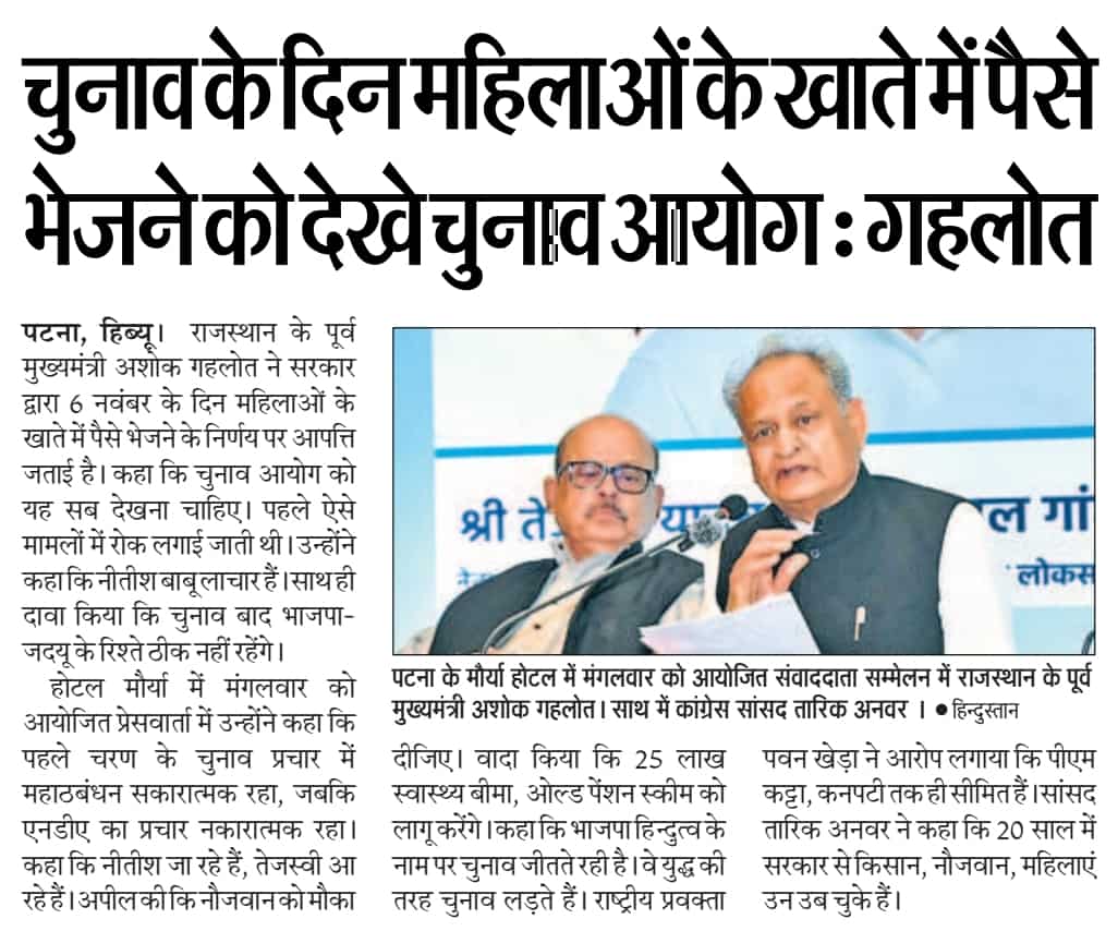 Bihar Mahila Rojgar Yojana Payment Date Announced : आचार संहिता लागू होने की वजह से किसी भी सरकारी योजना का पैसा जारी नहीं किया जा सकता है जिसे देखते हुए राज्यस्थान के पूर्व मुख्यमंत्री अशोक गहलोत ने सरकार द्वारा 6 नवम्बर के दिन महिलाओ के बैंक खाते में पैसे भेजने के निर्णय पर आपत्ति जताई है |