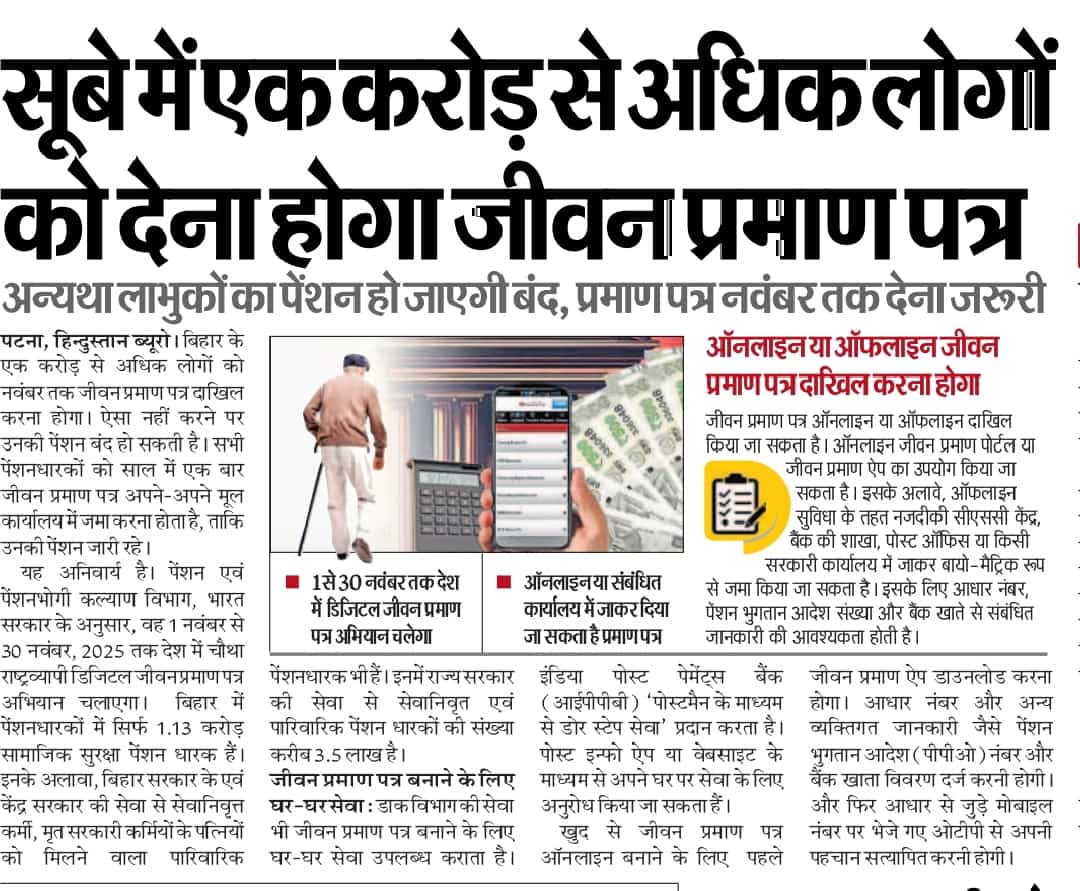 • जीवन प्रमाण पत्र जमा करने की तिथि :- 1 नवम्बर से 31 नवम्बर 2025 तक