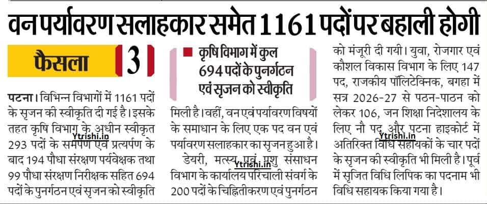 | Post Name | Bihar Recruitment 2026: 1161 पदों पर भर्ती को मंजूरी, कृषि विभाग में सबसे ज्यादा पद — पूरी जानकारी यहां |