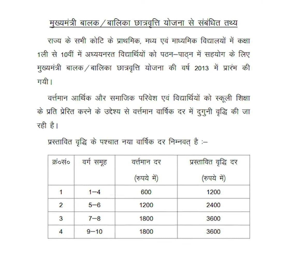 वित्तीय वर्ष 2025-26 से मुख्यमंत्री बालक/बालिका छात्रवृत्ति योजनान्तर्गत वर्ग 9वीं एवं 10वीं के सामान्य कोटि के छात्र/छात्रा (अल्पसंख्यक सहित) के लिए निर्धारित वार्षिक छात्रवृत्ति दर ₹1800/- (अठारह सौ) को संशोधित करते हुए ₹3600/- (छत्तीस सौ) वार्षिक पुनर्निधारित किये जाने की स्वीकृति एवं दर संशोधन के फलस्वरूप उक्त योजना हेतु कुल वार्षिक व्यय ₹99,21,24,000/- (निन्यानबे करोड़ इकिस लाख चौबीस हजार रुपये) की स्वीकृति के संबंध में।