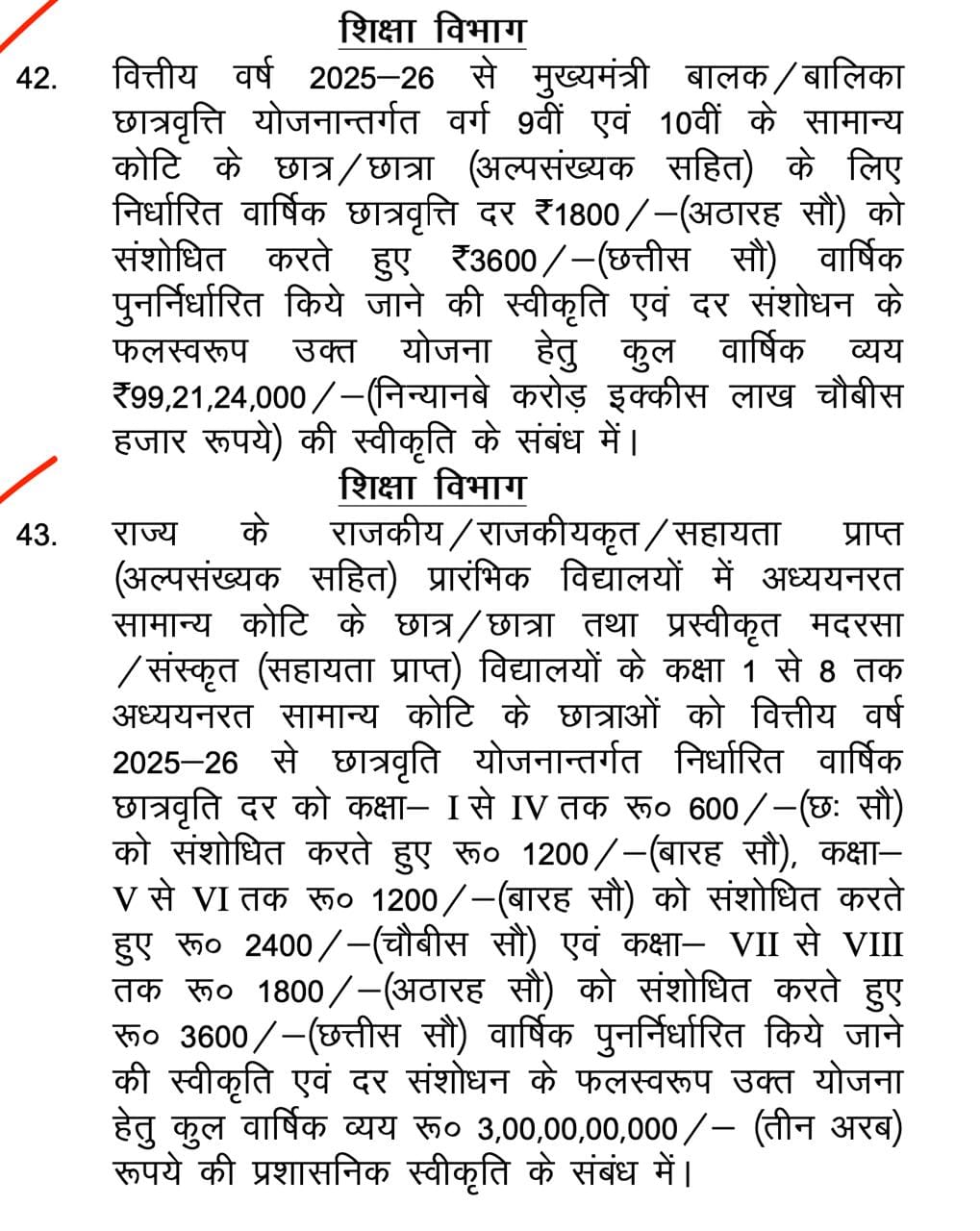 राज्य के राजकीय/राजकीयकृत/सहायता प्राप्त (अल्पसंख्यक सहित) प्रारंभिक विद्यालयों में अध्ययनरत सामान्य कोटि के छात्र/छात्रा तथा प्रवीणकृत मदरसा/संस्कृत (सहायता प्राप्त) विद्यालयों के कक्षा 1 से 8 तक अध्ययनरत सामान्य कोटि के छात्रों को वित्तीय वर्ष 2025-26 से छात्रवृत्ति योजनान्तर्गत निर्धारित वार्षिक छात्रवृत्ति दर को कक्षा I से IV तक रु. 600/- (छः सौ) को संशोधित करते हुए रु. 1200/- (बारह सौ), कक्षा V से VI तक रु. 1200/- (बारह सौ) को संशोधित करते हुए रु. 2400/- (चौबीस सौ) एवं कक्षा VII से VIII तक रु. 1800/- (अठारह सौ) को संशोधित करते हुए रु. 3600/- (छत्तीस सौ) वार्षिक पुनर्निधारित किये जाने की स्वीकृति एवं दर संशोधन के फलस्वरूप उक्त योजना हेतु कुल वार्षिक व्यय रु. 3,00,00,00,000/- (तीन अरब रुपये) की प्रशासनिक स्वीकृति के संबंध में।