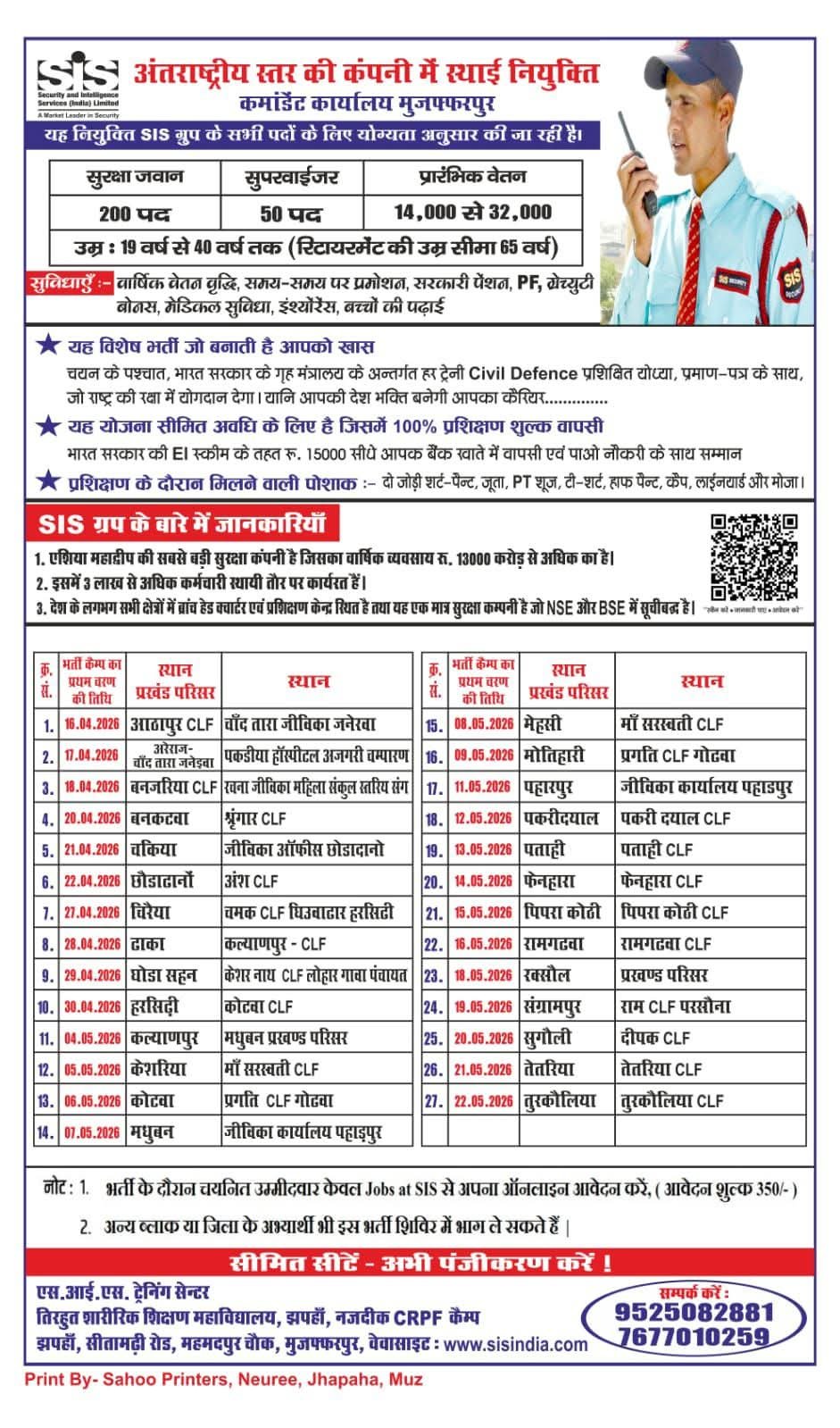 Bihar Security Guard & Supervisor Recruitment 2026 : SIS अन्तराष्ट्रीय स्तर की कंपनी में स्थाई नियुक्ति भर्ती निकाली गई है | ये भर्ती दो सुरक्षा जवान और सुपरवाइजर के पदों के लिए निकाली गई है | आपको बता दे की SIS ग्रुप एशिया महाद्वीप की सबसे बड़ी सुरक्षा कंपनी है जिसका वार्षिक व्यवसाय रु. 13000 करोड़ से अधिक है | इसमें 3 लाख से अधिक कर्मचारी स्थायी तौर पर कार्यरत है |