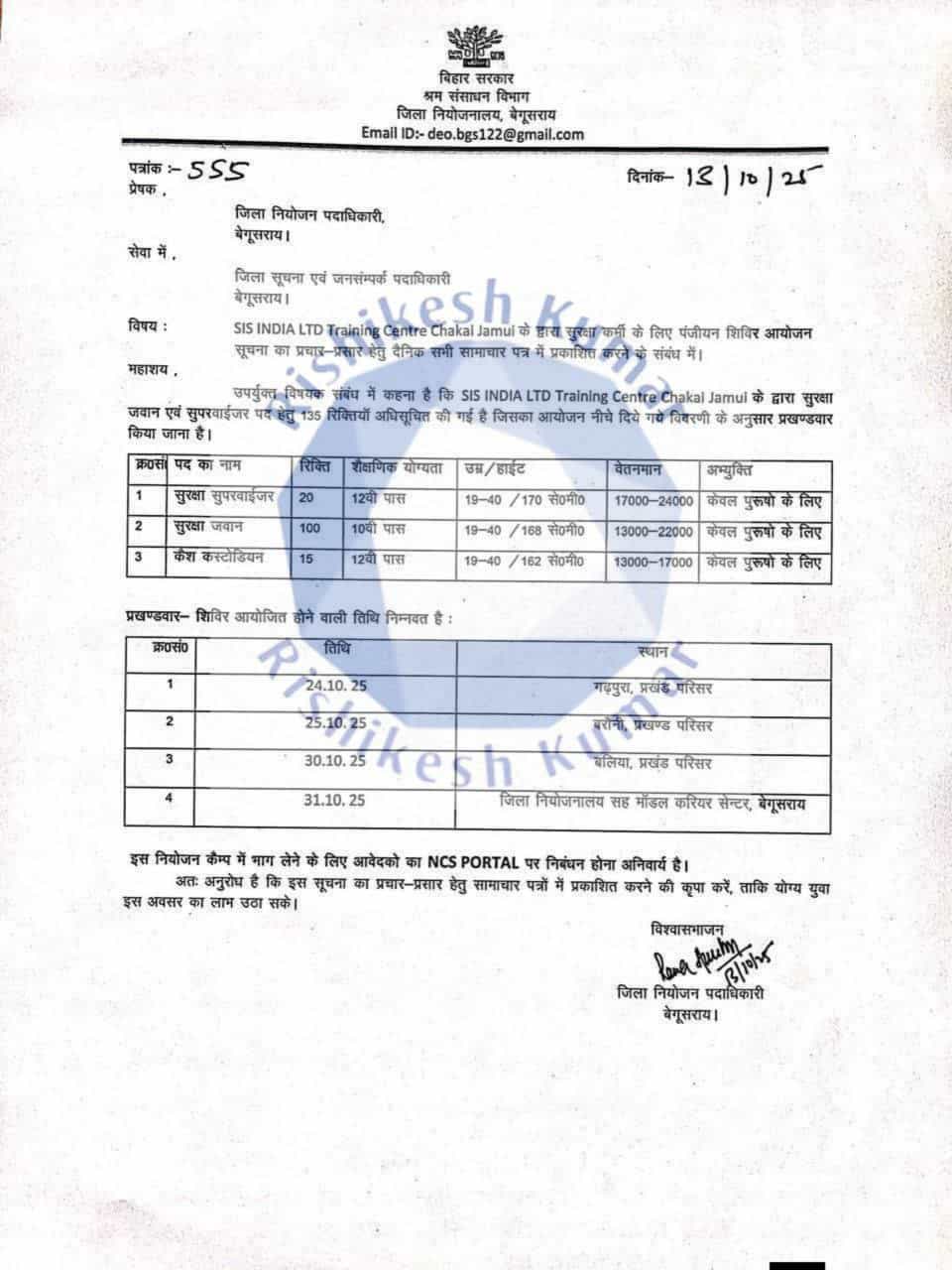 Bihar Security Guard & Supervisor Vacancy 2025 :- बिहार श्रम संसाधन विभाग के जिला नियोजन, बेगुसराय के तरफ से एक बहुत ही अच्छी भर्ती आई है | ये भर्ती SIS INDIA LTD Training Centre Chakai Jamui के द्वारा सुरक्षा जवान एवं सुपरवाइजर पद पदों पर निकाली गई है | इन पदों पर भर्ती को लेकर आवेदन शुरू कर दिए गये है | अगर आप इसेक लिए आवेदन करना चाहते है तो जल्द जल्द जाकर इसके लिए आवेदन करे |