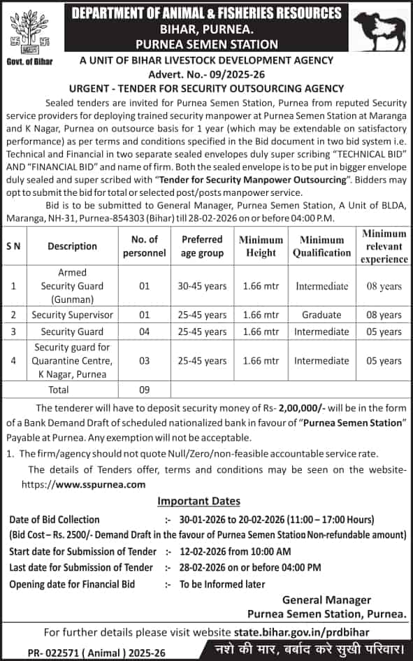 - Date of Bid Collection :- 30.01.2026 to 20.02.2026 (11:00- 17:00 Hours) (Bid cost – Rs. 2500/- Demand Draft in the favour of Purnea Semen station Non-refundable amount)