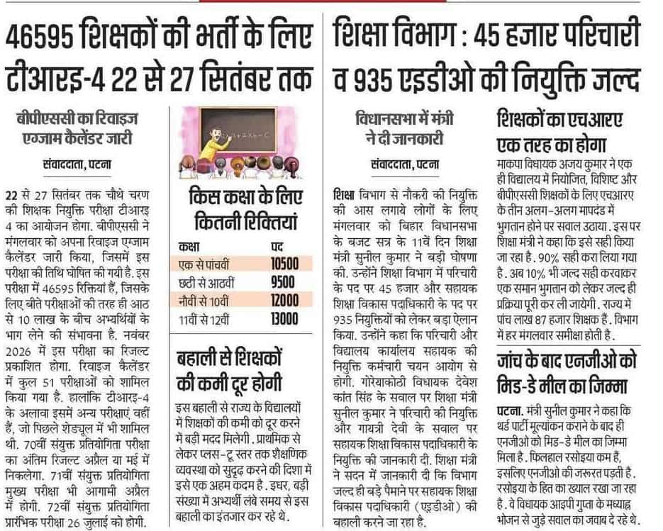 Bihar Shiksha Vibhag Clerk Parichari Vacancy 2026 : मंगलवार को बिहार विधानसभा के बजट सत्र के 11वें दिन शिक्षा मंत्री सुनील कुमार के तरफ से बड़ी घोषणा की गई है | उन्होंने शिक्षा विभाग में परिचारी के 45 हजार और सहायक शिक्षा विभाग पदाधिकारी के पद पर 935 नियुक्तियों को लेकर बड़ा ऐलान किया है |