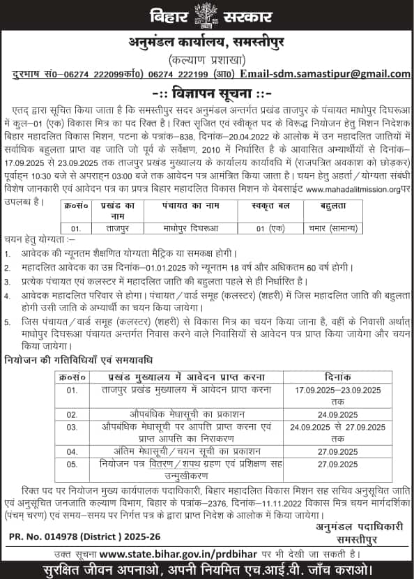 Bihar Vikas Mitra Vacancy 2025 Samastipur : Overviews