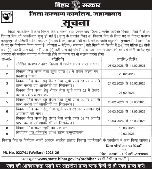 Bihar Vikas Mitra Vacancy 2026 Out :- बिहार विकास मित्र के पदों पर भर्ती निकाली गई है | ये भर्ती बिहार के जहानाबाद जिले के तरफ से निकाली गई है | इन पदों पर भर्ती को लेकर ऑफिसियल नोटिस जारी कर जानकारी दी गई है | इसके लिए आवेदन कब से कब तक लिए जायेगे, इसके लिए आवेदन करने के लिए क्या पात्रता रखी गई है इसके बारे में पूरी जानकारी इस आर्टिकल में विस्तार से दी गई है | अगर आप इन पदों के लिए आवेदन करना चाहते है तो इसके बारे में पूरी जानकारी के लिए आर्टिकल को पूरा जरुर पढ़े |