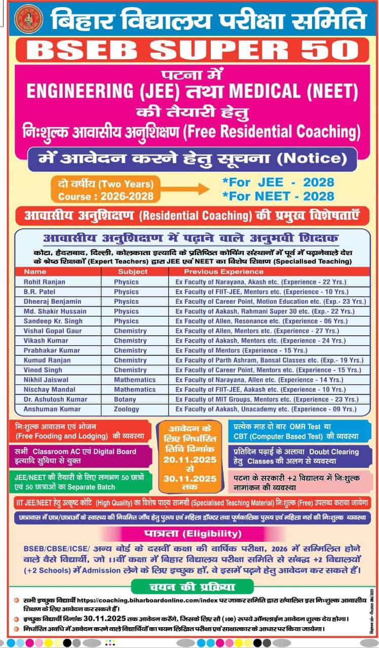 बिहार विद्यालय परीक्षा समिति के तरफ से BSEB Super 50 के तहत Engineering (JEE) तथा Medical (NEET) की तैयारी हेतु नि:शुल्क आवासीय अनुशिक्षण (Free Residential Coaching)