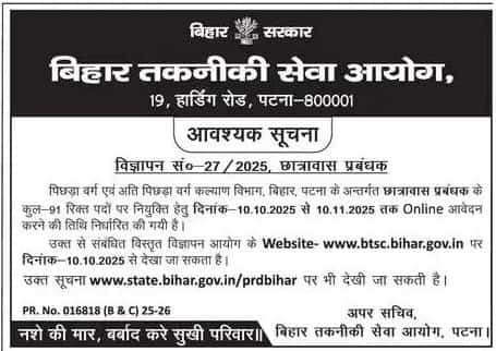 BTSC Hostel Manager Recruitment 2025 : BTSC के तरफ से छात्रावास प्रबंधक के 91 पदों पर भर्ती, ऐसे करे ऑनलाइन आवेदन