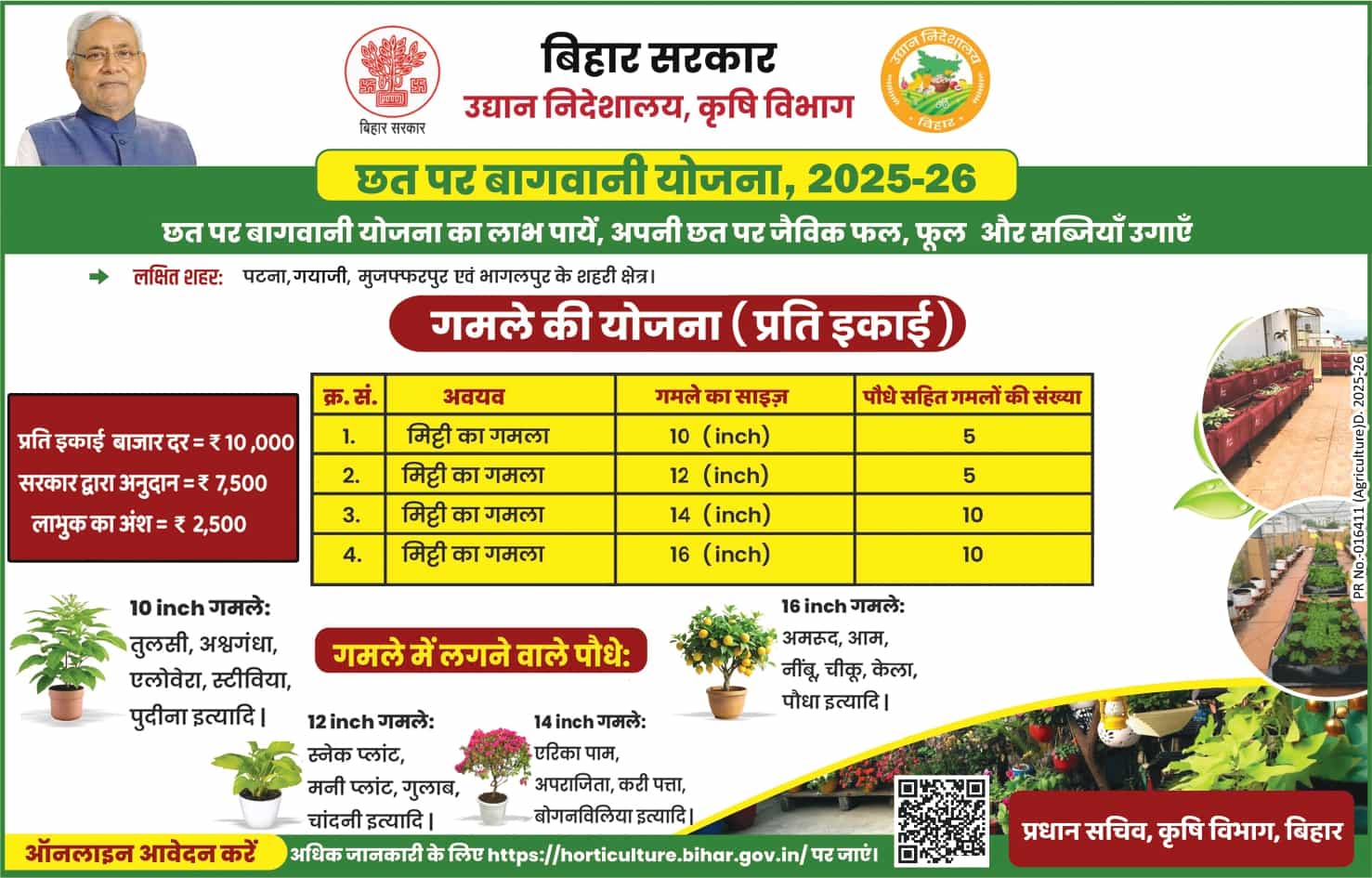 Chhat Par Bagwani Yojana 2025 :- बिहार सरकार के उद्यान निदेशालय, कृषि विभाग के तरफ से छत पर बागवानी योजना 2025 के तहत लाभ के लिए ऑनलाइन आवेदन शुरू कर दिए गए है | इस योजना के तहत छत पर गमले में पौधे लगाने के लिए सरकार के तरफ से अनुदान दिए जायेगे | इस योजना के तहत लाभ लेने के लिए आवेदन शुरू करने को लेकर विभाग के तरफ से ऑफिसियल नोटिस जारी कर जानकारी दी गई है |