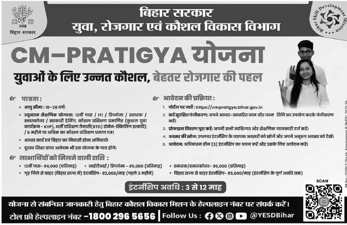 CM Pratigya Yojana 2026 :- बिहार सरकार के युवा, रोजगार एवं कौशल विकास विभाग के तरफ से CM-PRATIGYA योजना के तहत लाभ के लिए ऑनलाइन आवेदन शुरू कर दिए गये है | अगर आप इस योजना के तहत लाभ लेना चाहते है तो जल्द से जल्द से जल्द इसके लिए आवेदन करे | इसके लिए आवेदन करने को लेकर विभाग के तरफ से ऑफिसियल नोटिस जारी कर जानकारी दी गई है | इस योजना के तहत लाभ किस प्रकार से मिलता है , इसके तहत लाभ लेने के लिए क्या पात्रता रखी गई है इसके बारे में पूरी जानकारी इस आर्टिकल में विस्तार से दी गई है |
