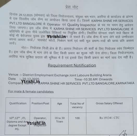 यह बिहार में Operator और Quality Inspector पदों पर होने वाली सीधी भर्ती की जानकारी है, जिसमें योग्य उम्मीदवार आवेदन कर सकते हैं।