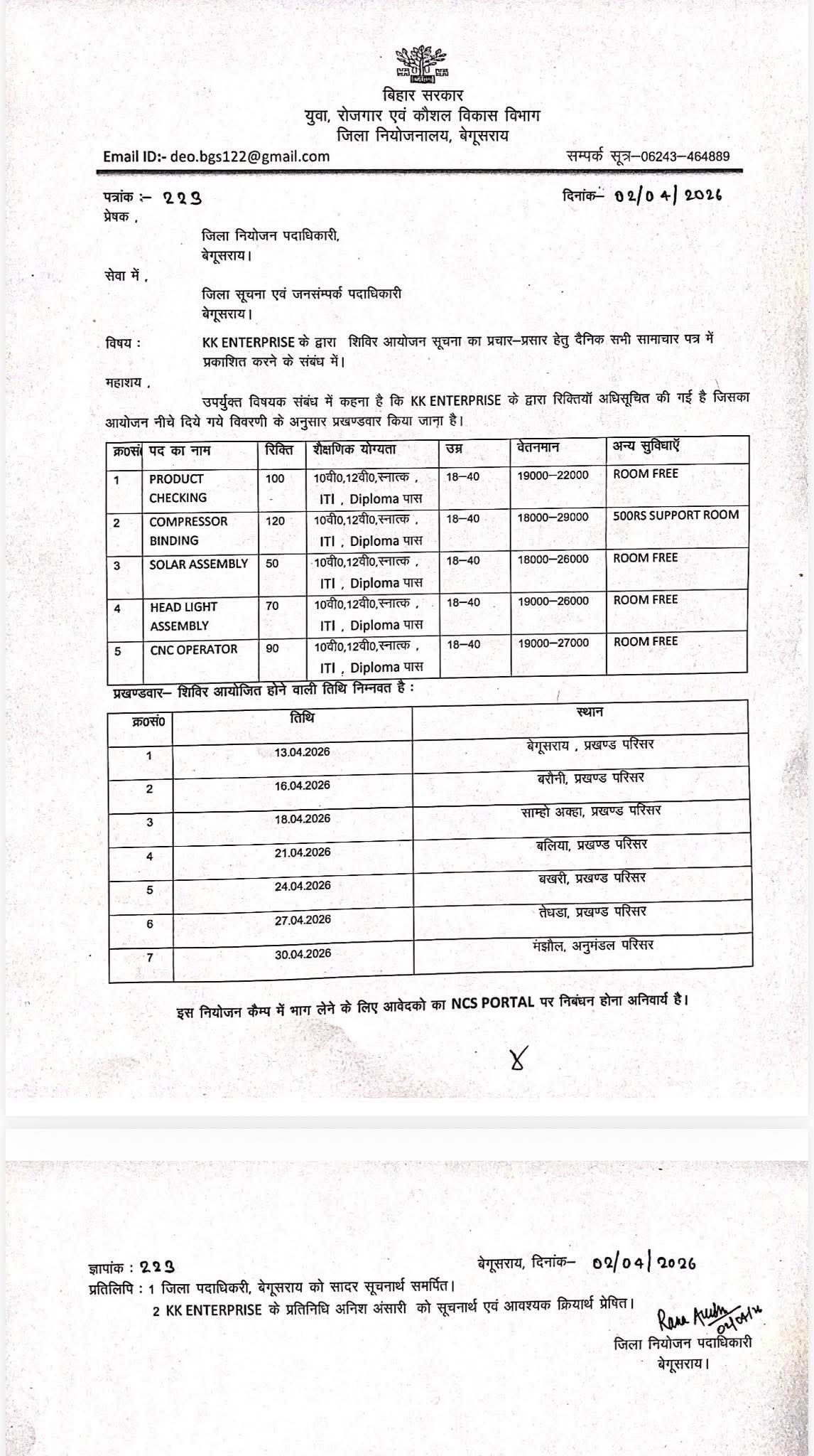 Bihar District Job Camp 2026 : आपको बता दे की इस बार रोजगार मेला का आयोजन बेगुसराय के अलग-अलग प्रखंड में किया जा रहा है | रोजगार मेला का आयोजन 13 अप्रैल से लेकर 30 अप्रैल 2026 तक अलग-अलग तिथि को अलग-अलग स्थानों पर किया जायेगा | इस रोजगार मेला में भर्ती अलग-अलग प्रकार के पदों पर लिए जायेगे |