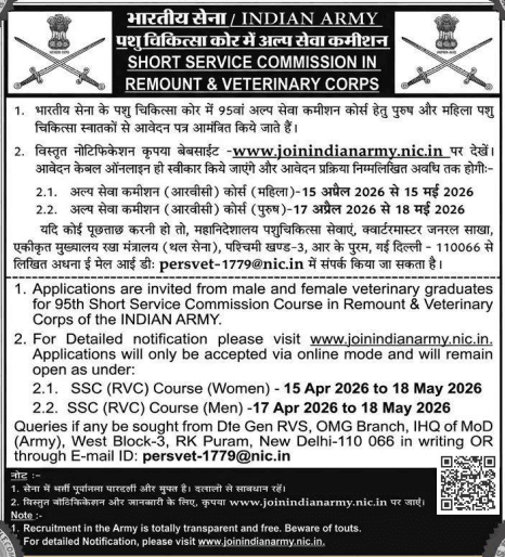 Indian Army 95th SSC RVC Recruitment 2026 :- Join Indian Army के तरफ से एक बहुत ही अच्छी भर्ती आई है | ये भर्ती 95th SSC RVC Veterinary Graduates 2026 को लेकर निकाली गई है | इन पदों अपर भर्ती को लेकर Short Notice जारी कर जानकारी दी गई है | इसके तहत भर्ती को लेकर आवेदन कब से कब तक लिए जायेगे, इसके लिए आवेदन करने के लिए क्या पात्रता रखी गई है इसके बारे में पूरी जानकारी इस आर्टिकल में विस्तार से दी गई है |