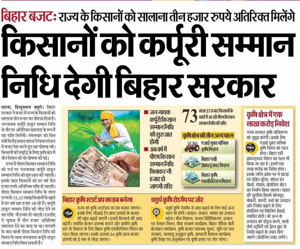 बिहार में राज्य सरकार के तरफ से कुछ समय पहले ही पीएम किसान सम्मान निधि योजना के तर्ज पर जननायक कर्पूरी ठाकुर सम्मान निधि योजना की शुरुआत की जाएगी |