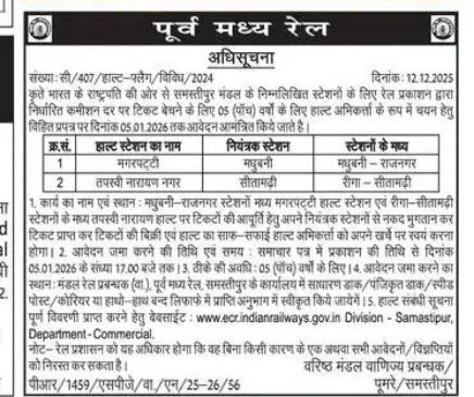 कार्य का नाम एवं स्थान :- मधुबनी – राजनगर स्टेशनॉन माध्यम मगरपट्टी हॉल्ट स्टेशन एवं रीगा-सीतामढ़ी स्टेशनों के माध्यम तपस्वी नारायण हॉल्ट पर टिकटों की आपूर्ति हेतु अपने नियंत्रक स्टेशनों से नकद भुगतान कर टिकट प्राप्त कर टिकटों की बिक्री एवं हॉल्ट का साफ-सफाई हॉल्ट अभिकर्ता को अपने खर्च पर स्वयं करना होगा |