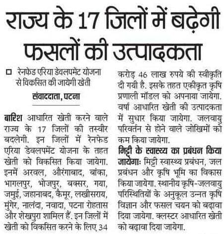 Rainfed Area Development Yojana : बिहार सरकार के तरफ से इन जिलो में खेती को विकसित करने के लिए करोड़ो रुपये को मंजूरी दे दी गई है| आपको बता दे की इन जिलो में खेती को विकसित करने के लिए सरकार के तरफ से 34 करोड़ 46 लाख रूपये की स्वीकृति दी गई है |