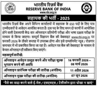 RBI Assistant Recruitment 2026 का notification फरवरी 2026 में जारी किया गया है। उम्मीदवार RBI की official website rbi.org.in से notification चेक कर सकते हैं।