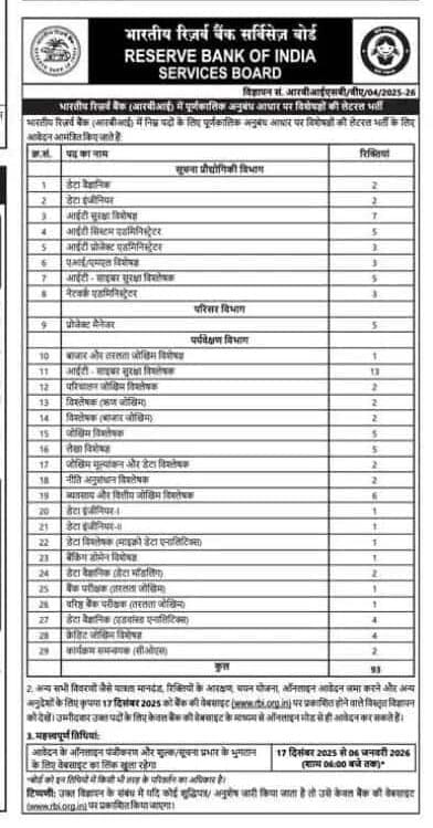 | Post Name | RBI Recruitment 2026 : RBI में बंपर भर्ती 2026: 93 Lateral Entry Posts, Notification जारी – अभी आवेदन करें |