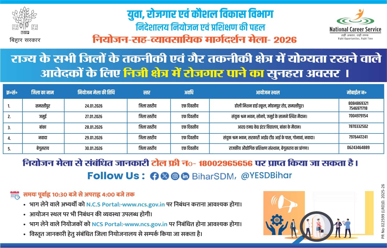 बिहार के युवा रोजगार एवं कौशल विकास विभाग के तरफ से नियोजन-सह-व्यावसायिक मार्गदर्शन मेला-2026 का आयोजन किया जा रहा है | आपको बता दे की इस बार रोजगार मेला का आयोजन बिहार के 5 अलग-अलग जिले में किये जा रहे है | राज्य के सभी जिलो के तकनीकी एवं गैर तकनीकी क्षेत्र में योग्यता रखने वाले आवेदकों को निजी क्षेत्र में रोजगार पाने का सुनहरा मौका है | बिहार रोजगार मेला आयोजन कब कहाँ और किस प्रकार से किया जायेगा इसके बारे में पूरी जानकारी निचे विस्तार विस्तार में पढ़े सकते है |