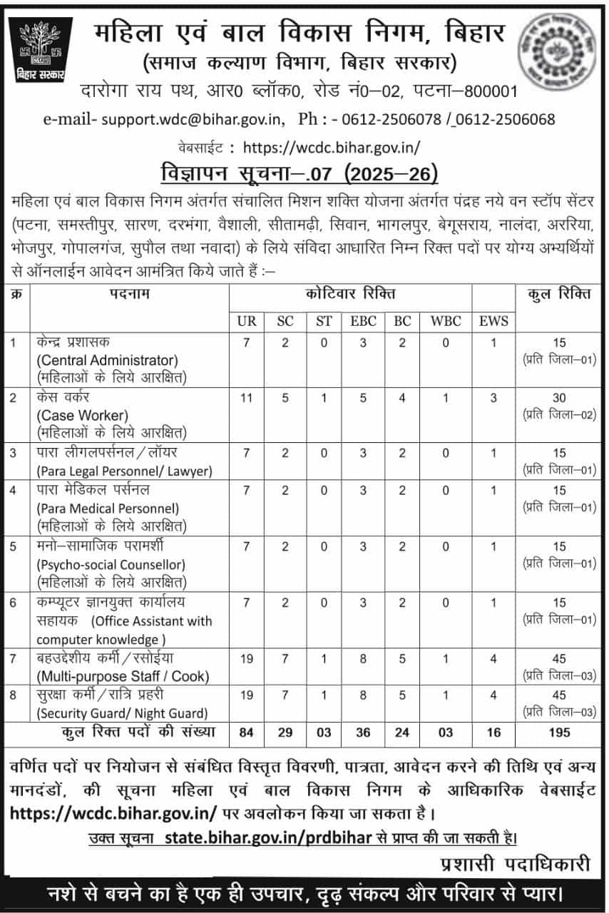 यह भर्ती महिला एवं बाल विकास निगम (WCDC Bihar) द्वारा निकाली गई है।
